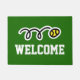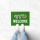 Custom tennis ball design welcome doormat. Make your own custom monogrammed indoor / outdoor door mat with custom background colour and text. Add your own welcome message, family name, surname, initial letter or funny quote. Fun gift idea for new club, home / housewarming, store, shop, company office, business etc. Modern sport typography with crossed tennis rackets. Personalizable template. Create your own classy entry mat / rug for front door / entryway or hall. Customizable home decor / decorations for your house. Gift ideas for tennis player, fan, coach etc. Green or custom colour background.