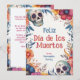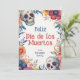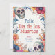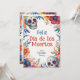 The “Eternal Celebration” Dia de Muertos flat greeting card features a vibrant and colourful border composed of traditional elements such as decorated skulls, known as calaveras, and an assortment of flowers that add to the festive feel of the design; the central part of the card is reserved for a customizable text area, which currently reads “Feliz Día de Muertos” in bold, stylized lettering at the top, followed by “from [custom name]” at the bottom where “Fernandez Family” is currently placed; this indicates that the sender’s name can be personalized; the background behind this text appears to be a plain white colour which contrasts with the vivid border, ensuring that any custom message added will stand out clearly; the back of the card provides space for a custom message and features the same floral and skull-patterned background as the front, maintaining a consistent and festive design throughout.