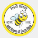 A cheerful bee is in the centre of this honey jar label. You can edit the text to create your custom message. The display text says 'Fresh Honey NET WT. 16 OZ. Add Name of Farm Here. The sticker is round. The bee is inside a white circle that has a black and yellow border. The text is black.