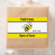 A cheerful bee is in the center of this honey jar label. You can edit the text to create your custom message. The display text says 'Fresh Honey NET WT. 16 OZ. Name of Farm. The text is black.