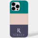 Beautiful elegant minimal custom phone case design featuring a colour block of three (rose gold/blush pink, teal/deep aqua, mullet wine/gun powder/lavender grey) in pastel rose gold pale hues and personalized name and monogram in sophisticated typographic fonts.