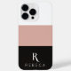 Beautiful elegant minimal custom phone case design featuring a colour block of three (rose gold, black, white) in pastel rose gold pale hues and personalized name and monogram in sophisticated typographic fonts.