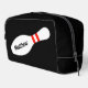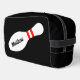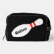 Custom toiletry bag with bowling pin design. Cool gift idea for bowler. Black or custom colour Dopp Kit. Personalize with name or monogram.