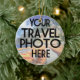 You will love this custom 2 photo 2 sided travel photo Christmas ornament with two photos if you've travelled this year and want to remember a special place this year. With this unique personalized Christmas keepsake ornament you can add your own photos as well as your travel location and the year of your travel in trendy hand lettered script typography. Easy to customize with your travel location, date of travel, and two of your own photos.