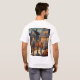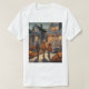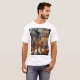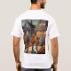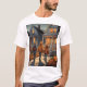 This is a Custom Halloween t-shirt. The art features three children in front of a house carrying trick or treat bags. The Halloween design was created with generative art. There are pumpkins and jack o lanterns by the sidewalk. The t-shirt shown is white. The t-shirt is a comfortable cotton t-shirt. You can change the image by clicking the Personalize button.