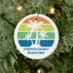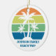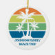 These cool personalized tropical beach sunset family Christmas ornaments feature 3 palm trees silhouetted against an orange and blue sky accented with yellow and green at the coast. Customize these family trip keepsake gifts with a coastal photo on the back from your spring break or summer or ocean cruise vacation.