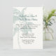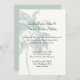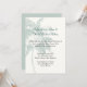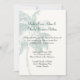 Elegant tropical wedding invitation done in cream, with faint graphics of a light teal coloured palm tree. Text in dark grey and teal is ready to personalize for your beach theme wedding. Great invitation for a tropical destination wedding.