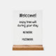 This sleek and modern acrylic pedestal sign presents a 'Welcome! Enjoy free wifi during your stay - Network: - Password: - Enjoy your stay' message in crisp black and white text on a transparent background. It offers personalization options to tailor your message. This sign provides a straightforward and friendly way to share internet login information with your vacation rental guests.
