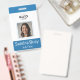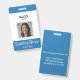custom blue vertical badge with an employee photo and name. Personalize it with an employee ID number, role, title, location, or other important details. Add your company logo at the top for a professional touch. The back of the badge features a custom text field for return information or other key details. This design makes personalization easy, ensuring each badge is unique and fits your company's needs perfectly.