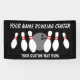 Custom vinyl banner with bowling ball and pins. Make your own personalized banner with custom name, business name, team name etc. Great for bowling alley, party, sports event, club, tournament and more. Colours can be changed.