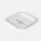 Custom wedding monogram square paper plates. Elegant script typography template for personalized name. Stylish party supplies for marriage, engagement, anniversary, Birthday and more. Great for serving homemade food, cake, desserts, sweets, treats and more. Available in small and large sizes. Classy black and white design.