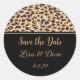 Round Wedding sticker Save the Date shown in a black and safari leopard print.