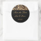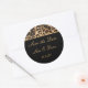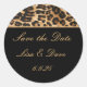 This round wedding sticker Save the Date is shown in a black and safari leopard print.