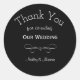 Thank you sticker for wedding party favours, thank you notes, or small gifts. Change the message to match your occasion showers, receptions, etc. Change background using your wedding colours. Personalize with newlyweds name.