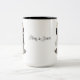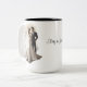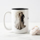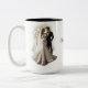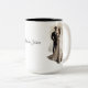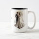 This custom name wedding coffee mug is shown with sample names and a bride and groom art print.