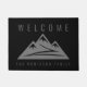 Custom welcome door mat with mountain logo. Modern design doormat with mountain peaks. Elegant black and gray design with family name.