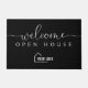 Introducing our custom open house welcome doormat, designed specifically for real estate agents. It's more than just a mat—it's a statement piece that reflects your commitment to excellence. Shown in a classic black and white palette with a modern script font for "welcome", though all colours are editable. Personalize the template with your event title as well as upload your business logo. © Kimbellished, LLC