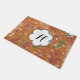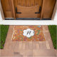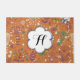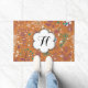 A beautiful design featuring flying floral birds of wine, teal, and white on an orange rust coloured background full of pretty little wildflowers and dandelions of teal, white, and wine. This fun, colourful, whimsical door mat features a white flower shape banner that you can easily personalize with your monogram initial!