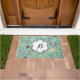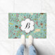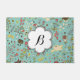 Whimsical Flower Garden, a beautiful, colourful, fun, whimsical design of cream, dark brown, coral, blue, and green flowers and birds on a pretty aqua blue background. This fun, colourful, whimsical door mat features a white flower shape banner that you can easily personalize with your monogram initial!