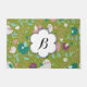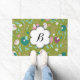 Pretty, colourful, cute, whimsical describes our Whimsy Tweety Birds on Vines design doormat. Features little birds of teal, wine, white, and pink on aqua vines with little white flowers, pink swirls, all on a green background. This fun, colourful, whimsical door mat features a white flower shape banner that you can easily personalize with your monogram initial!