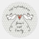 An illustration of 2 beautiful doves holding flowing ribbon with a love heart attached.