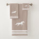 Three stripes on light beige and custom white horse image. Elegant modern towel set.