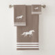 Three stripes on lucky beige and custom white horse image. Elegant modern towel set.