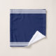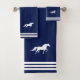 Three stripes on navy blue and custom white horse image. Elegant modern towel set.