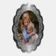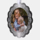 Contemporary classic Christmas holiday season ornament card with ivory cream off-white coloured mandala wreath on a classic faux silver metallic background. With option and room to customize the text, family name and year date, and add a personal photo of your choice on the front, and a customizable season greeting message on the backside of the card.