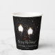 Custom "Happy Holidays" or your favourite Christmas seasonal greeting is simple to print on paper cups for your personal or corporate party. The illustration features black white and gold glowing street lamps beneath falling snow lighted by the lamps and glistening on the black night background. We've provided three ines for whatever information you wish to include or delete a line and upload your logo. A separate line, in tiny white lettering, is for the date of your event. Or simply delete. This design is fully customizable to meet your needs when designing a paper cup for your winter holiday party.