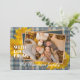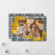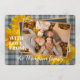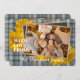 Unique, classy, trendy, pretty and decorative Thanksgiving holiday card. Cute WITH LOVE FROM text and room to customize or personalize with a photo and names (or family name) of your choice. With cute classic warm yellow fall Mums flowers pumpkins on a teal blue, ochre mustard brown and grey coloured rustic farmhouse inspired plaid tartan pattern background design. And a customizable season greeting poem on the backside of the card.