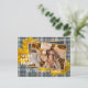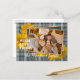 Unique, classy, trendy, pretty and decorative Thanksgiving holiday card. Cute WITH LOVE FROM text and room to customize or personalize with a photo and names (or family name) of your choice. With cute classic warm yellow fall Mums flowers pumpkins on a teal blue, ochre mustard brown and grey coloured rustic farmhouse inspired plaid tartan pattern background design. And a customizable season greeting poem on the backside of the card.