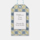 A custom soap or craft tag with block and script letters on an antique tile art pattern in blue, white and yellow. Customize it to change fonts, change label size