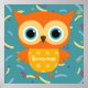Adorable yellow owl blue pattern kids poster. Vintage kids room decor.