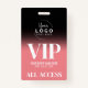 Special Event Your Logo Pink Black All Access VIP Badge. Great for fashion shows, concerts, large special events like conferences, speakers, and can even work for a birthday party or any other party where you want to make your guests feel special. A simple modern, yet elegant, look with a spot to add your company or even logo up top (or replace with a fun icon if doing for a birthday type of event). At bottom is a bold serif font mixed with simple typography, with VIP, the event name, date, and 'All Access Pass'. You can change all of the text information and colours of this badge (except the top black gradient.