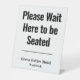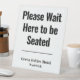 Restaurant Customer Message. Customer Instructions for Hotel or Restaurant use. Table top signs showing message plus name of business. Black lettering. Example says "Please Wait Here to be Seated".