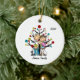 A cute, fun ceramic ornament featuring a stick figure couple, toddler boy, baby girl, a medium size white dog, grey cat, holiday tree. Customized with Johnson Family 2018.
