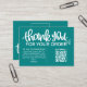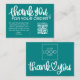Express your gratitude with our teal Customer Thank You Package Insert QR Code Coupon business card. This thoughtfully designed card features a QR code that leads your customers to an exclusive discount or special offer, showing appreciation for their loyalty. Make a lasting impression and strengthen your customer relationships with this personalized and stylish gesture.