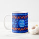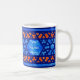 A pretty white mug with a traditional Islamic trellis pattern in two shades of blue and orange back and front. There is a panel in the middle of the design where you can put the name you require. This design was handpainted by Judy Adamson.