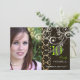 Flat invitations vintage black baroque damask, fluorescent green trim accent (which can be customized), adorned with pearl swirls. Again, the swirls is completely adjustable... you can copy and paste it wherever you wish, including the reversed side. We layered this damask over a vintage faux parchment paper to give a rustic look. Simply add your graduate photo. Copyright © 2010 PixDezines.com and PixDezines on zazzle.com