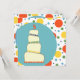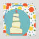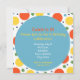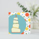 A customizable birthday party invitation featuring a background of youthful shades of orange, green, yellow, and blue on front and back. Front features illustration of an off white birthday cake with four off centred rounded tiers over large blue dot. Cake is decorated with colourful dots. Customize the number at top of cake. Personalize the back with details of your occasion.