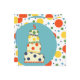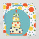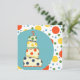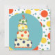 A customizable birthday party invitation featuring a background of youthful shades of orange, green, yellow, and blue on front and back. Front features illustration of an off white birthday cake with four off centred rounded tiers over large blue dot. Cake is decorated with colourful dots. Customize the number at top of cake. Personalize the back with details of your occasion.