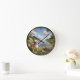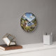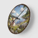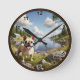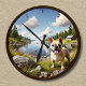 • This customizable clock features a cheerful French Bulldog on a peaceful lakeside with natural rocks, lush greenery, and a cozy cabin in the background.