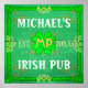 Create your own custom, Irish pub, home bar wall poster using this template. The poster is made to look like old green wood with plenty of vintage flourishes in shades of green, white, orange and gold. There are also five shamrocks / clovers in the design. These posters can be personalized with your own name, initials / monogram and the year your brewery, bar or Ireland-themed man cave was established. Just fill in the easy diy template or click "Customize It" if your text runs long & you need to resize, rearrange or change text colours & fonts. These are perfect for Saint Patrick's Day or all year long. See matching items in our store!