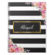 This customizable spiral bound notebook has a black and white striped background with a beautiful floral design in two corners. Such a pretty feminine notebook would make a great gift idea teenage girls and women!