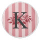 This knob features a customizable monogram on red cabbage roses. The background is pink vertical stripes. To change the letter press "Customize" and then "Edit text".