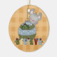 A Christmas mouse with a big Christmas ball ornament and text that reads "Believe" against a golden yellow checked background and a back you can personalize with a name, year, or other text on ornaments you're sure to treasure for years to come!