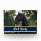 Bring your horse indoors to your home with this customizable photo set! Exchange the picture with one from your own equestrian adventures. Near the bottom is text displayed in a navy and gold colour scheme. Change the text your horse's name. There is plently of space to accomodate a full registered or show name if desired.