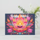 This Diwali card glistens with spiritual warmth and festive charm. A stunning lotus takes centre stage, its layered petals painted in rich pinks, tangerine, and deep violet, each one radiating outward like ripples from a sacred flame. Nestled at its heart is a glowing diya, flickering gently with golden light. The backdrop is a twilight canvas of midnight blue, speckled with delicate dots and flourishes, adding a celestial touch.