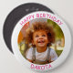 Customizable photo and name birthday button. Pink text on a small white frame.